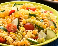 160 g de lait concentré non sucré BONNET ROUGE, Pâtes coquillettes, 2 boîtes de thon, 1 pomme, Du maïs doux, 1 concombre, 1 oignon, 2 tomates cerises, 2 cuillères à soupe de vinaigre de cidre ou balsamique, 1 cuillère à soupe de moutarde, 3 cuillères à soupe d’huile d’olive, Du sel et du poivre