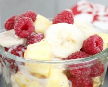 1 L de lait frais BONNET ROUGE, 5 sachets de lait en poudre BONNET ROUGE, 1 L d'eau, 1 pot de yaourt nature, 2-3 cuillères à soupe de sucre (ajuster selon votre goût), Fruits frais (fraise, framboise, mangues, etc.)
