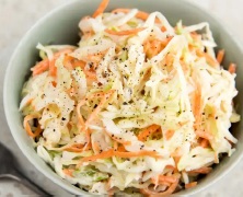 125 ml (1/2 tasse) de mayonnaise, 30 ml (2 cuillères à soupe) de vinaigre de cidre, 15 ml (1 cuillère à soupe) de sucre, 5 ml (1 cuillère à thé) de poudre d’ail, 45 ml (3 c. à soupe) de crème 35 %, 1 L (4 tasses) de chou vert émincé à la mandoline ou au robot culinaire, 125 ml (1/2 tasse) de céleri tranché finement à la mandoline ou au robot culinaire, 1/2 petit oignon, râpé, 1 carotte, râpée, Sel et poivre (au goût)