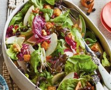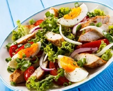 Laitue iceberg, Tomate, Emmental, Oeuf(s), Blanc de poulet, 15 cl d’huile d’olive, Vinaigre, Du sel, du poivre.
