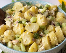 160 g de lait concentré non sucré BONNET ROUGE, Pâtes coquillettes, 2 boîtes de thon, 1 pomme, Du maïs doux, 1 concombre, 1 oignon, 2 tomates cerises, 2 cuillères à soupe de vinaigre de cidre ou balsamique, 1 cuillère à soupe de moutarde, 3 cuillères à soupe d’huile d’olive, Du sel et du poivre